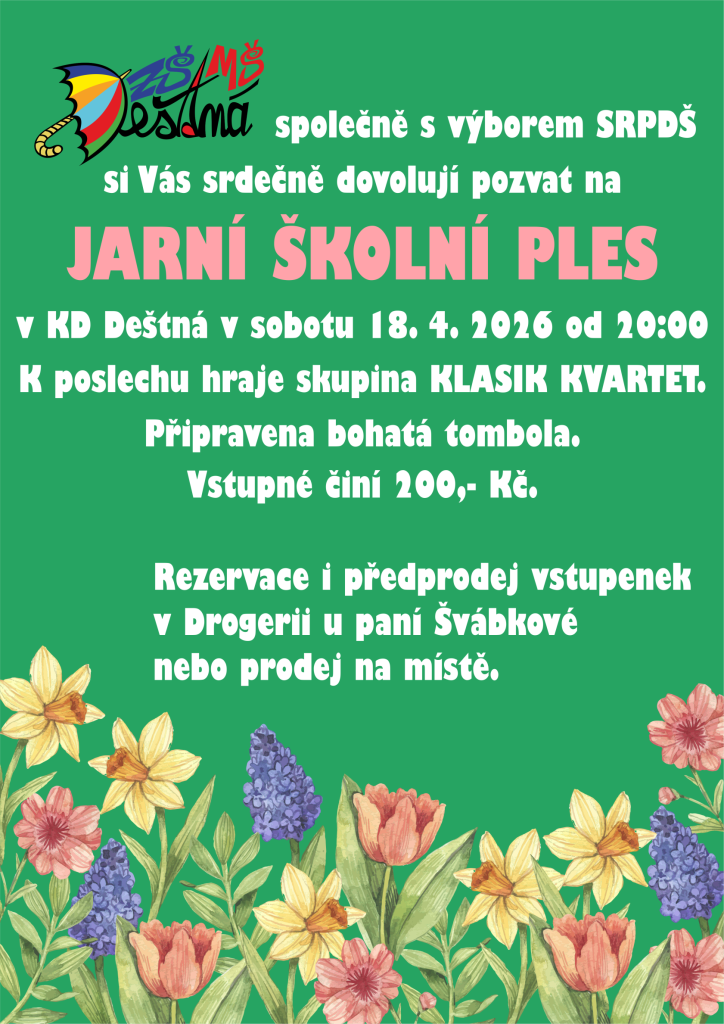 SRPDŠ a ZŠ a MŠ Deštná Vás srdečně zvou na jarní školní ples, který se uskuteční v sobotu 18. dubna 2026 od 20 hodin